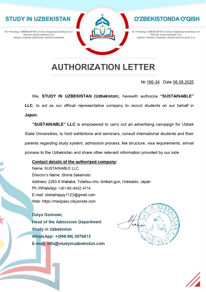 当事務局は、ウズベキスタン国立大学・医学コース(授業言語 英語)の指定公認代理店の日本窓口です。
